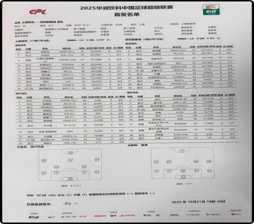 北京时间10月31日20:00,中超联赛第29轮继续进行,排名第3的上海申花主场迎战排名12的深圳新鹏城。本场比赛在上海体育场进行,主裁判是麦麦提江。赛前双方首发阵容公布如下:
