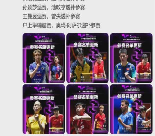 北京时间今天(10月21日)19时,WTT世界乒联发布WTT蒙彼利埃冠军赛2025参赛球员更新:王楚钦退赛,宇田幸矢递补参赛;林诗栋退赛,裴焕递补参赛;梁靖崑退赛,温瑞博递补参赛;孙颖莎退赛,池旼亨